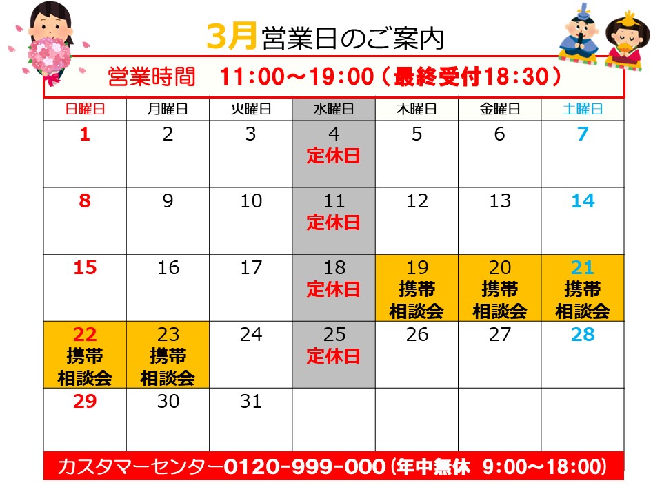 | 営業時間 | 11:00~19:00(最終受付18:30) |