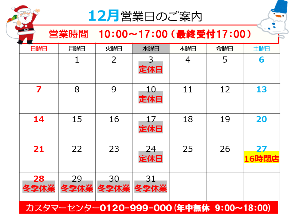 | 営業時間 | 通常時間 10:00~17:00 変則営業日 12/27(土)は16:00閉店 12/28(日)~冬季休業 |