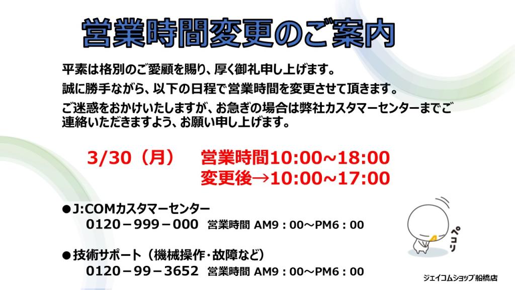 | 営業時間 | 営業時間:10:00~18:00 3/30(月)のみ10:00~17:00 |