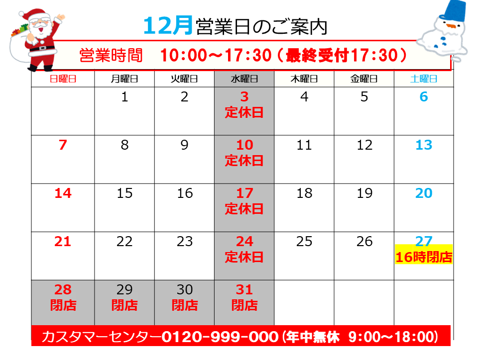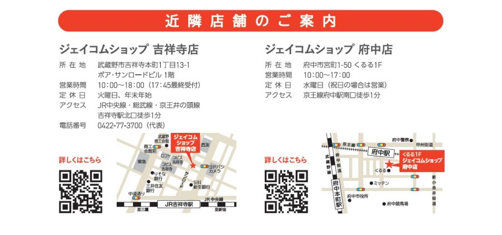 | 営業時間 | 10:00~17:30(水曜定休) 変則営業日 12/27(土)16:00閉店 ※国分寺店は2025/12/27(土)で完全閉店致します。 |